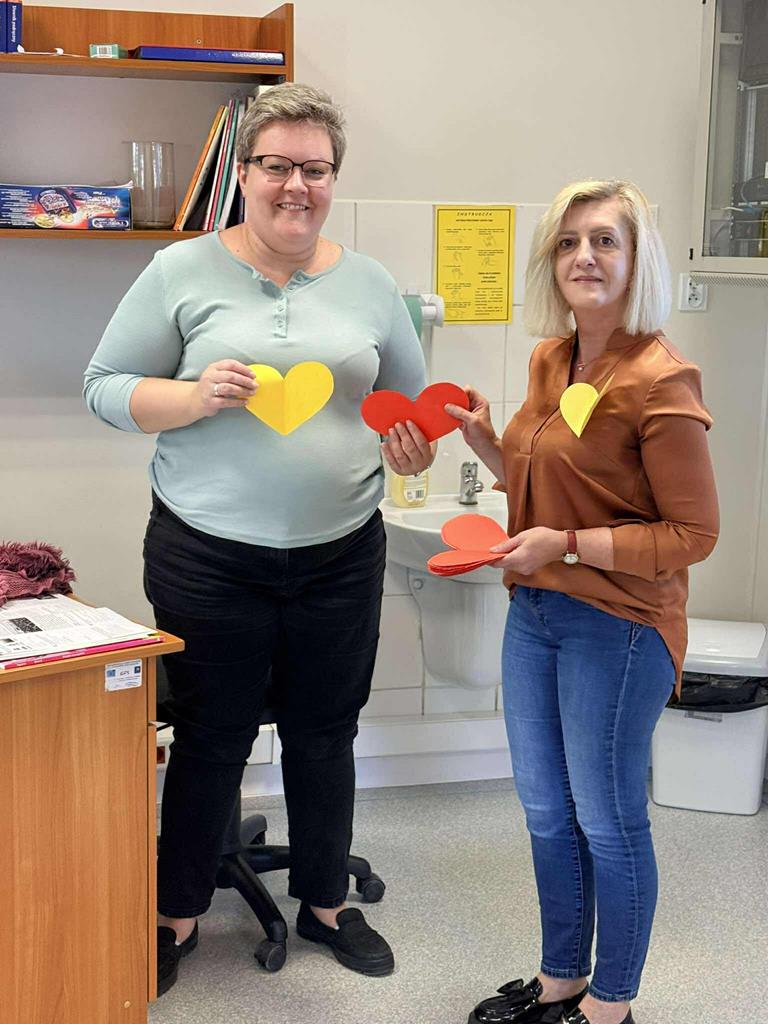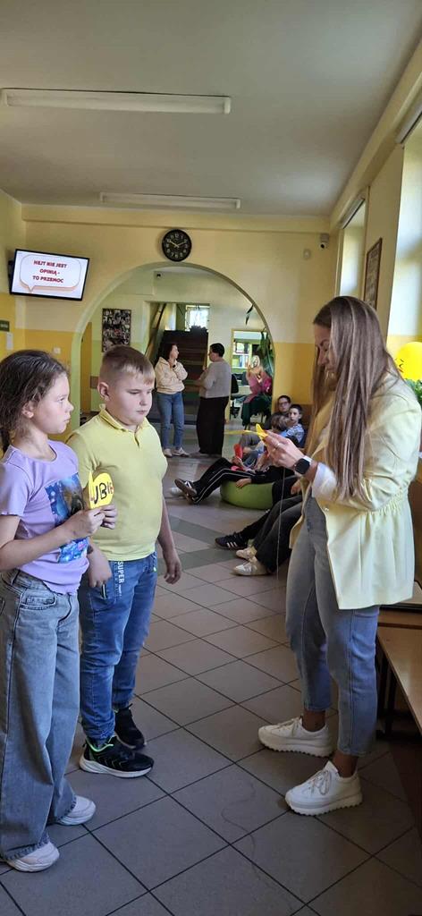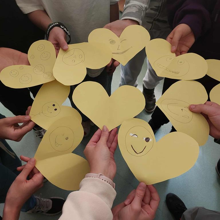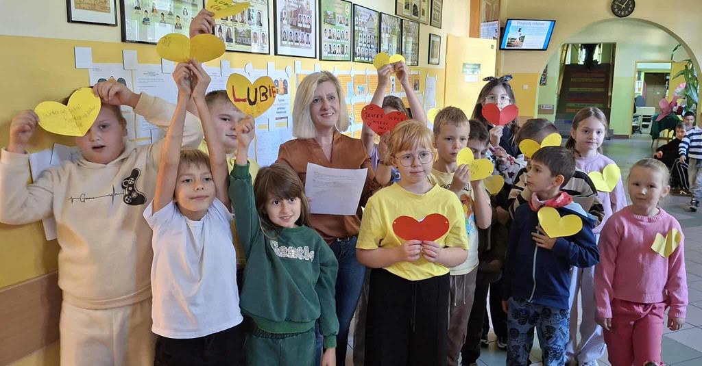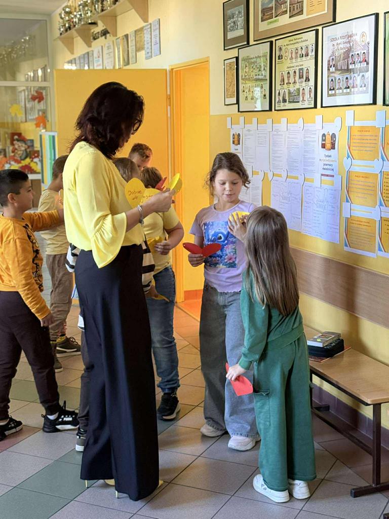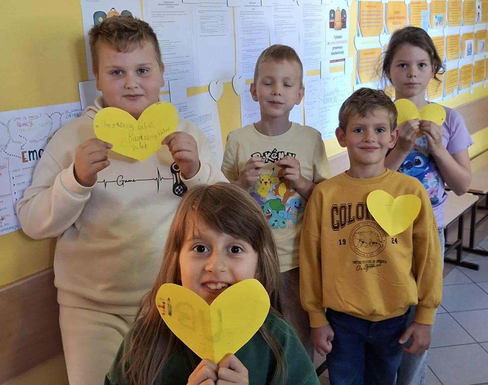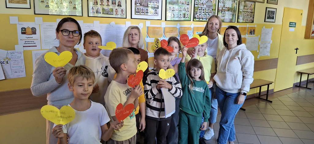 Zwieńczeniem całego tygodnia było dzisiejsze Święto Przyjaźni, które podkreślało to, co najważniejsze w relacjach rówieśniczych – zaufanie, wzajemną pomoc i radość ze wspólnego bycia razem. Na korytarzach pojawiły się żółte i czerwone serduszka promujące przyjaźń, a uczniowie obdarowywali się „życzliwymi karteczkami” – krótkimi wiadomościami pełnymi dobrych słów. W klasach odbywały się zabawy i zadania wzmacniające więzi.
