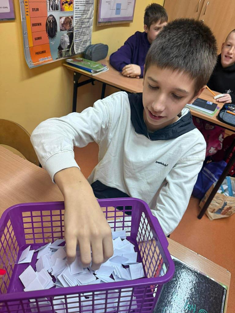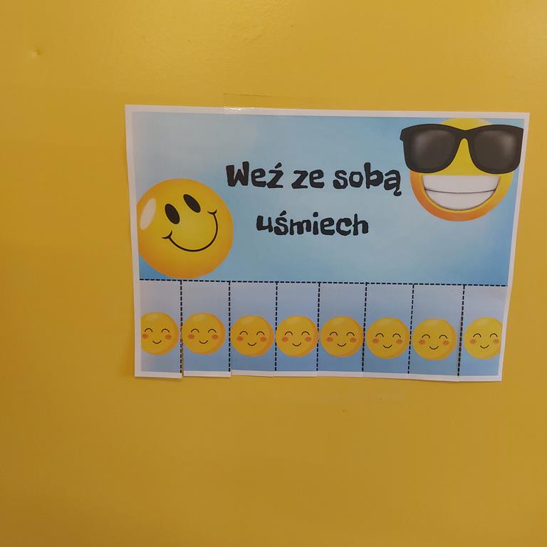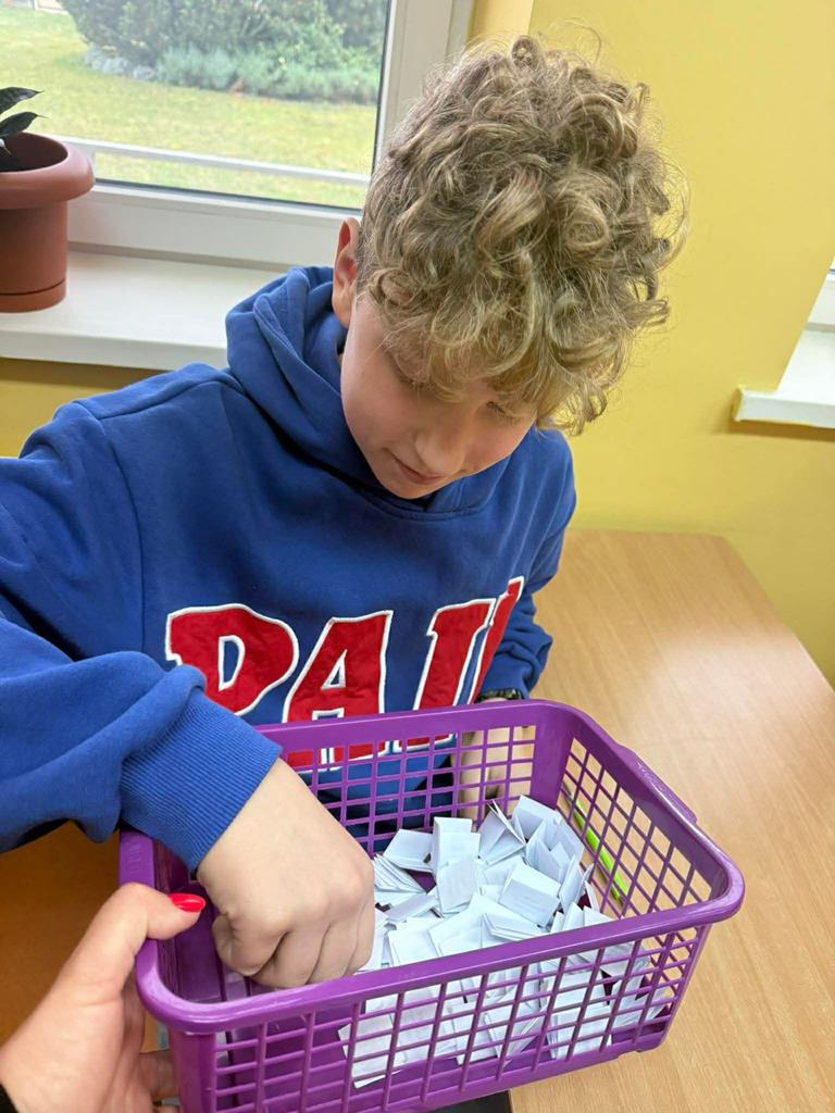 Już od samego rana uczniowie mogli brać udział w akcji „zrywek”, czyli losowaniu karteczek z pozytywnymi hasłami i miłymi słowami. Wśród nich znalazły się m.in. krótkie sentencje motywujące, wyrazy wsparcia, zachęty oraz proste komunikaty sprawiające, że dzień od razu stawał się przyjemniejszy. Dzieci chętnie dzieliły się wylosowanymi słowami z innymi, a część z nich zatrzymała karateczki jako osobistą pamiątkę.