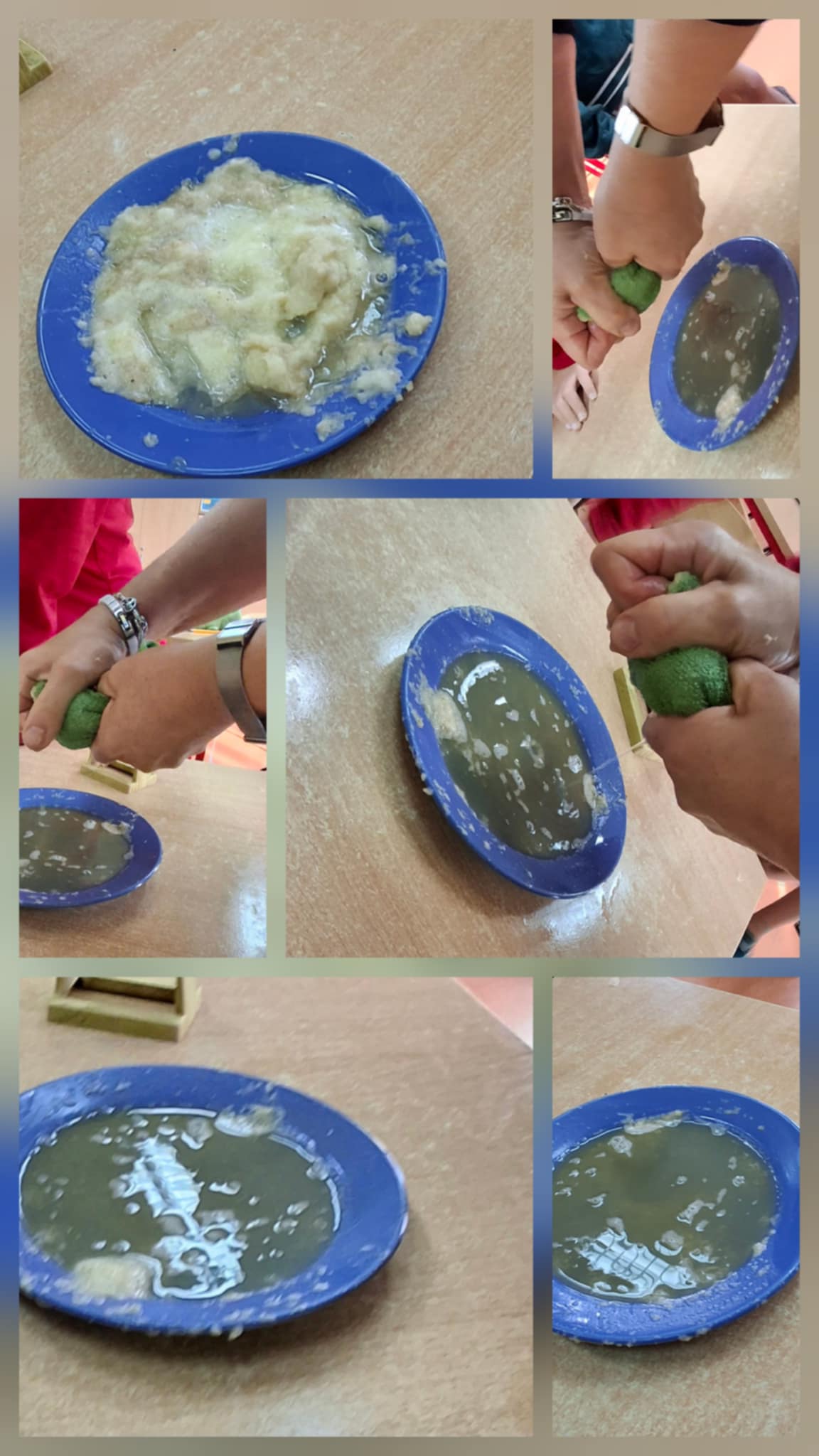 Ostatnim etapem było doświadczenie „Jak powstaje skrobia?”, podczas którego uczniowie ścierali ziemniaki, odcedzali sok i obserwowali biały osad – czystą skrobię, która po dodaniu jodyny przybierała granatową barwę.