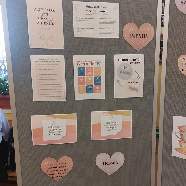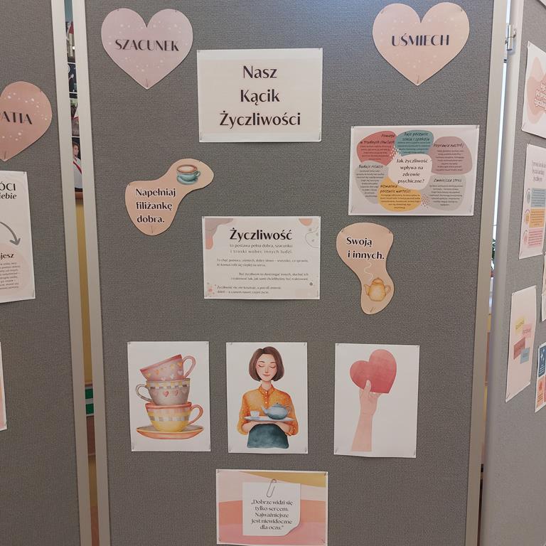 Na szkolnym korytarzu pojawiła się także gazetka tematyczna, na której znalazły się przykłady życzliwych zachowań, inspirujące cytaty oraz wskazówki, w jaki sposób możemy okazywać sobie dobro na co dzień. Uczniowie zatrzymywali się przy niej, czytali treści, komentowali i dyskutowali o przedstawionych pomysłach.