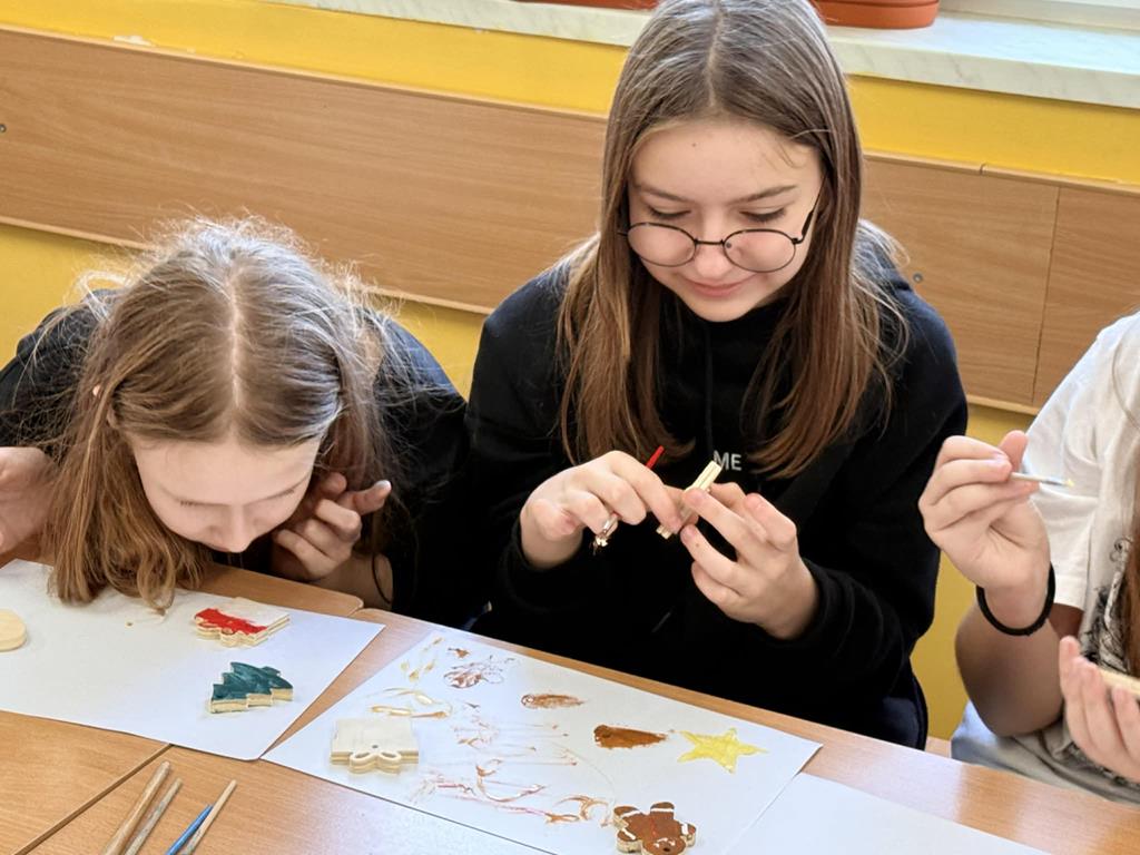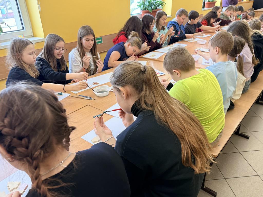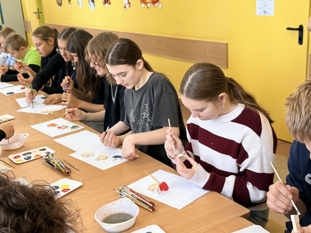 Uczniowie z zapałem malowali drewniane dekoracje, wykorzystując kolorowe farby. Kreatywność i radość tworzenia można było dostrzec na każdej twarzy! Wspólna praca sprawiła, że czas upłynął w niezwykle przyjemnej atmosferze.