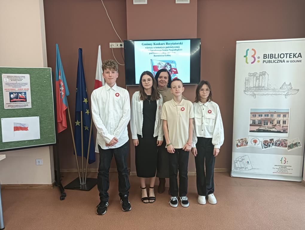 Wzięło w nim udział również czworo uczniów naszej szkoły: z klasy VI Blanka Wilant i Nikodem Urbański recytowali wiersz Marii Konopnickiej ,,Tam, w moim kraju”; z klasy VII – Michał Dryjer zaprezentował ,,Rotę”, a Vanessa Laskowska z klasy VIII wyrecytowała wiersz Tadeusza Kubiaka” ,,Tu wszędzie Polska”.
