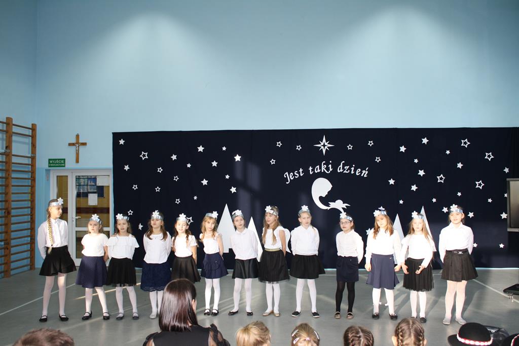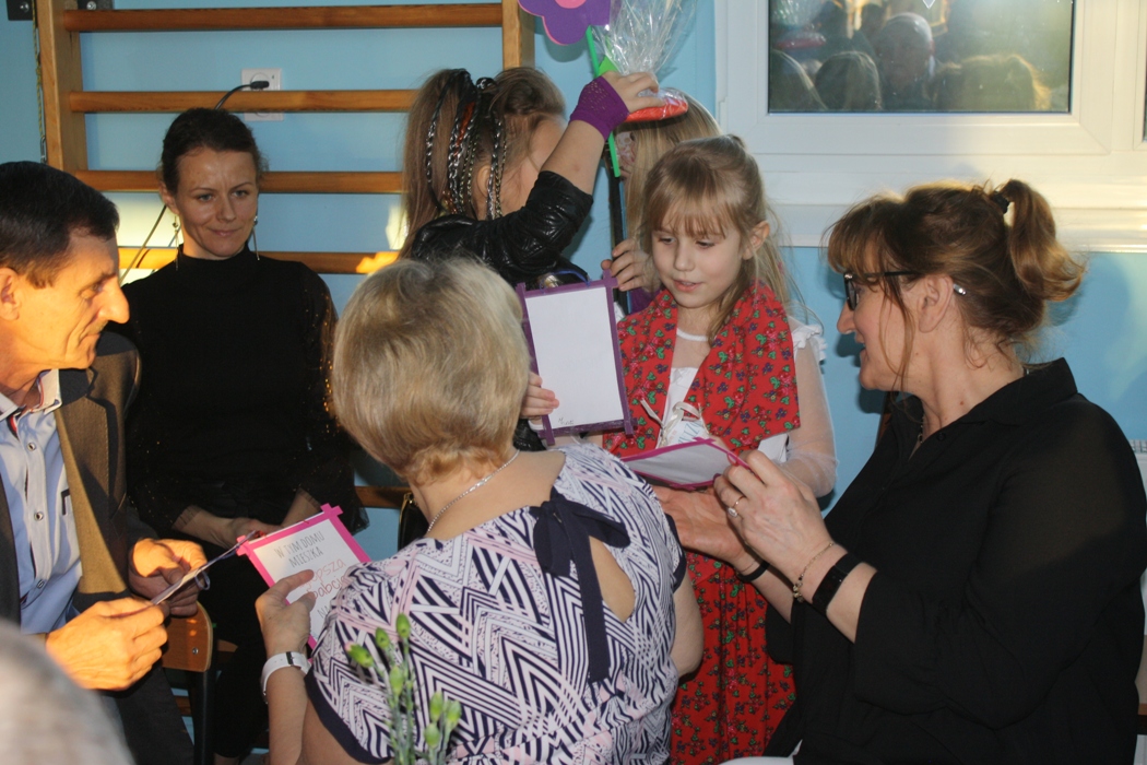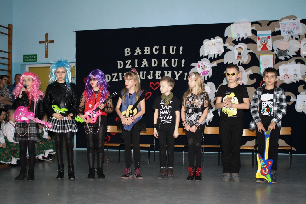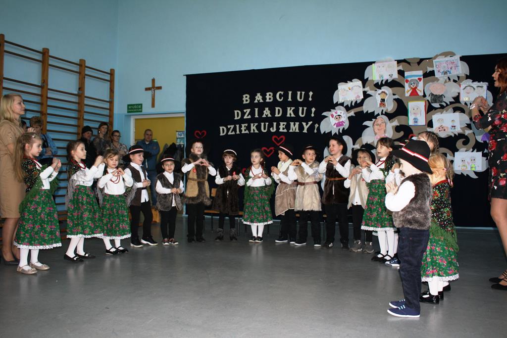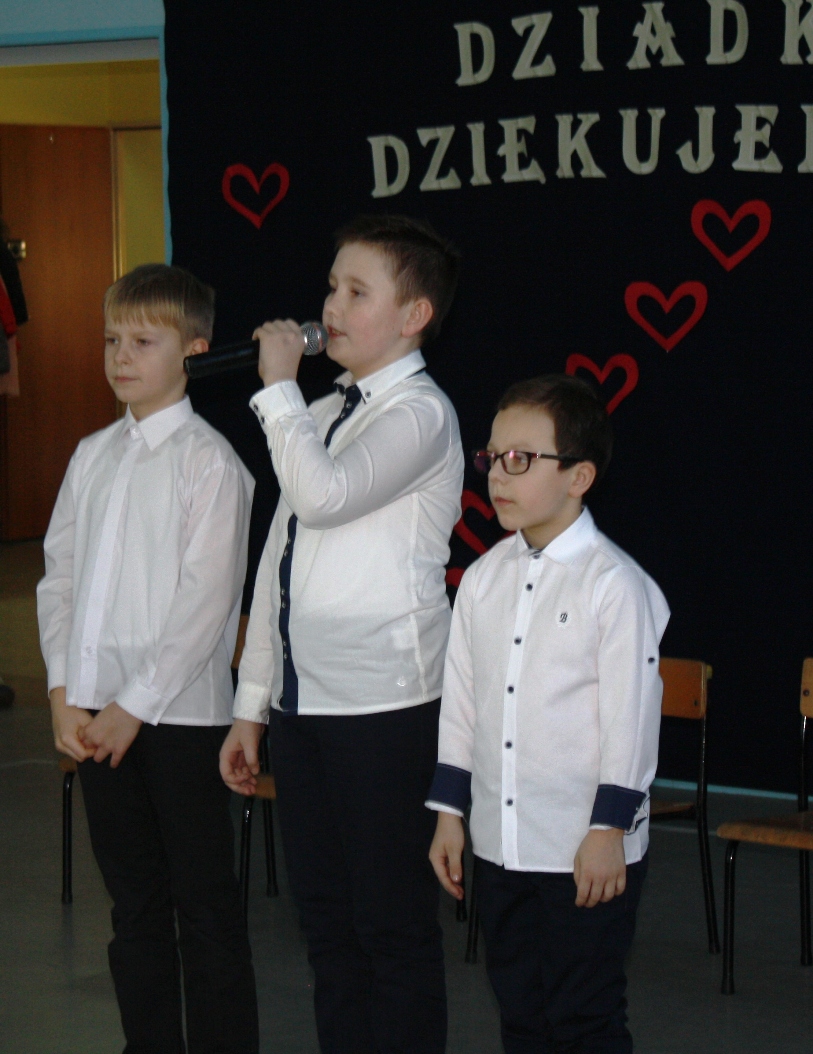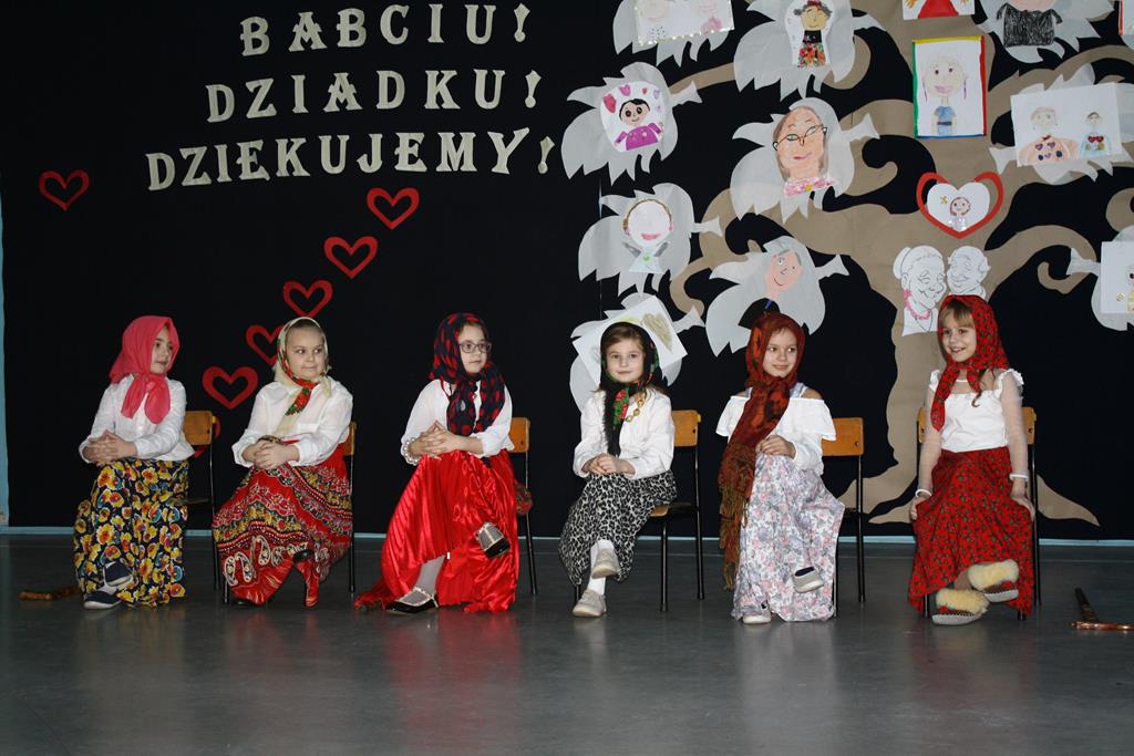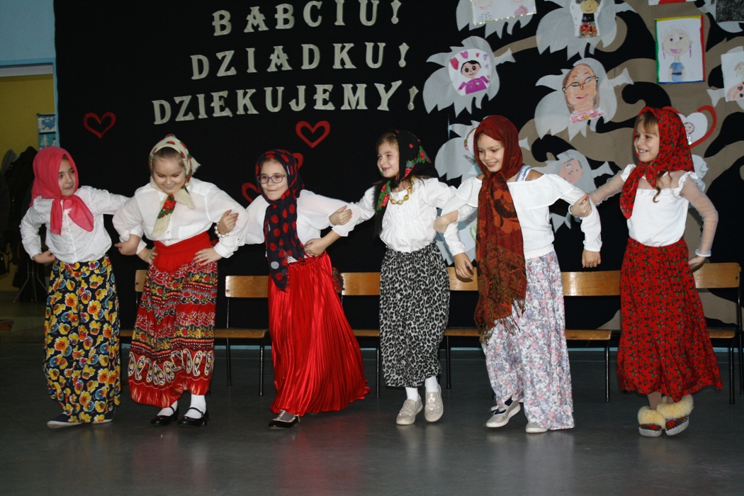 z klasy II pod opieką p. Barbary Jarońskiej przygotowały taniec „Babuszki staruszki”. Po nich uczniowie z klasy III pod kierunkiem p. Magdaleny Lewartowskiej zaprezentowali wiersze, oraz złożyli życzenia i podziękowania dla babć oraz dziadków.
