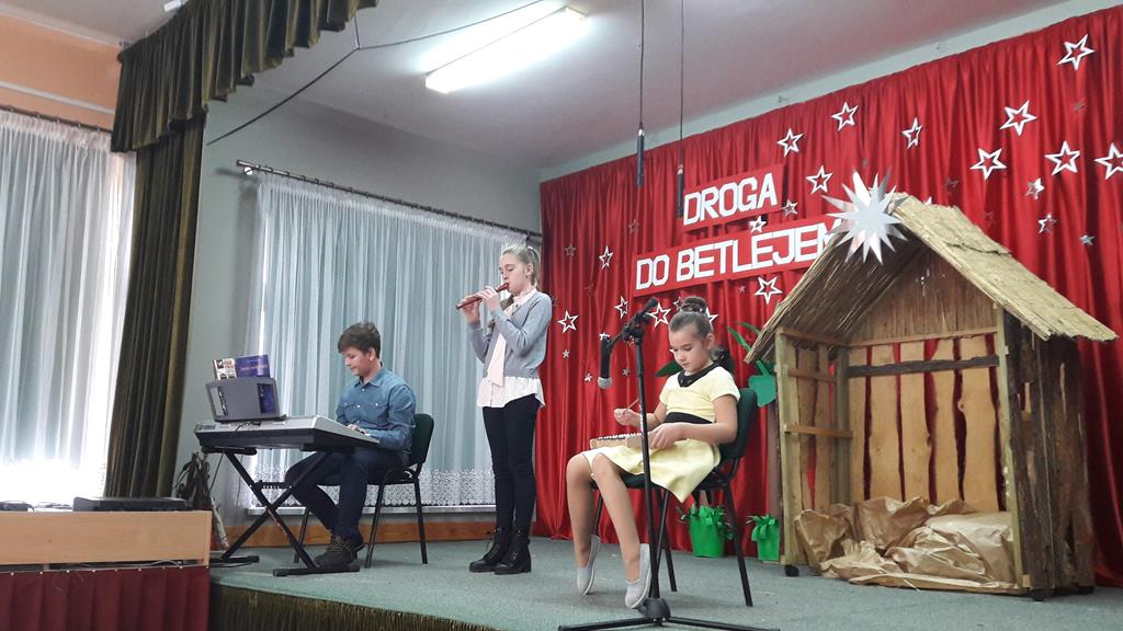 imgimg14 grudnia 2019r. uczniowie naszej szkoły wzięli udział w Gminnym Przeglądzie Twórczości Bożonarodzeniowej- Konkursie Śpiewania Kolęd, zorganizowanym przez Dom Kultury w Golinie. W kategorii klas I- III naszą szkołę reprezentowała Zuzanna Kurleto z utworem wokalnym pt. „Bosy pastuszek”. Starsza grupa: Michalina Kurleto (kl. VI) i Krzysztof Hinz (kl. VIII) wraz z Zuzią przedstawiła instrumentalną wersję międzynarodowej kolędy „Cicha noc”. Za swoją grę na instrumentach w dwugłosie trio otrzymało wyróżnienie otrzymując nagrody rzeczowe.