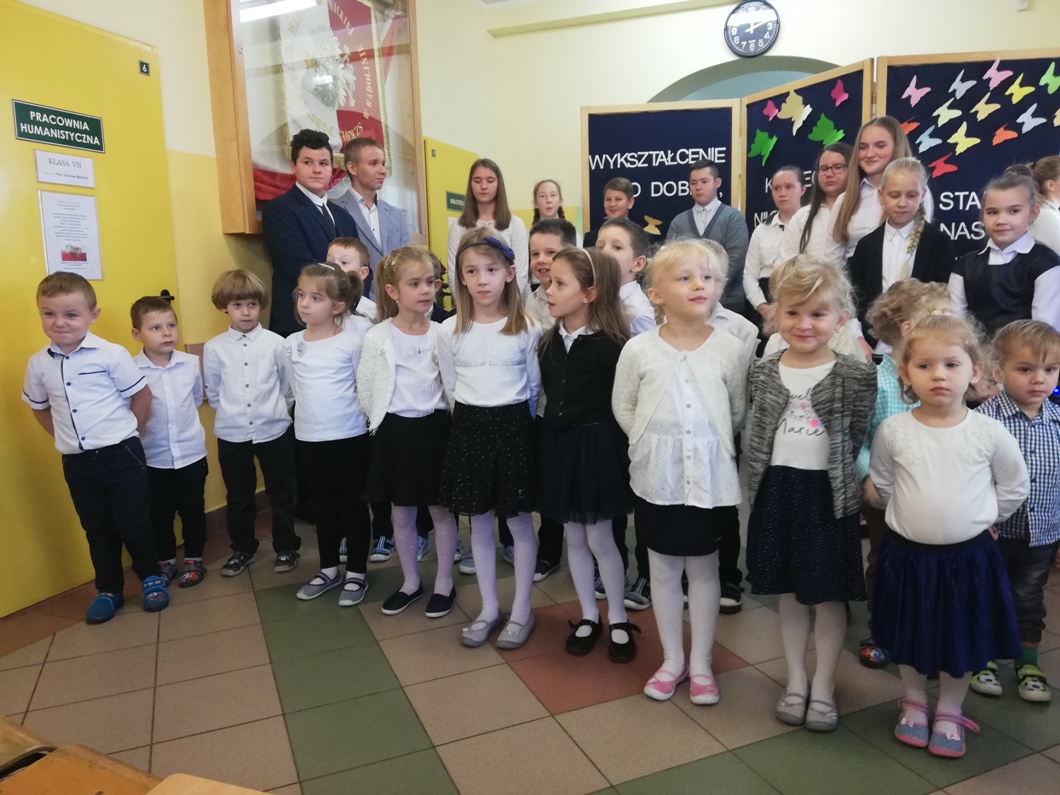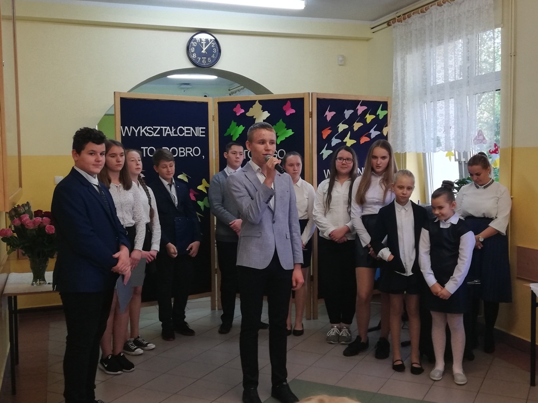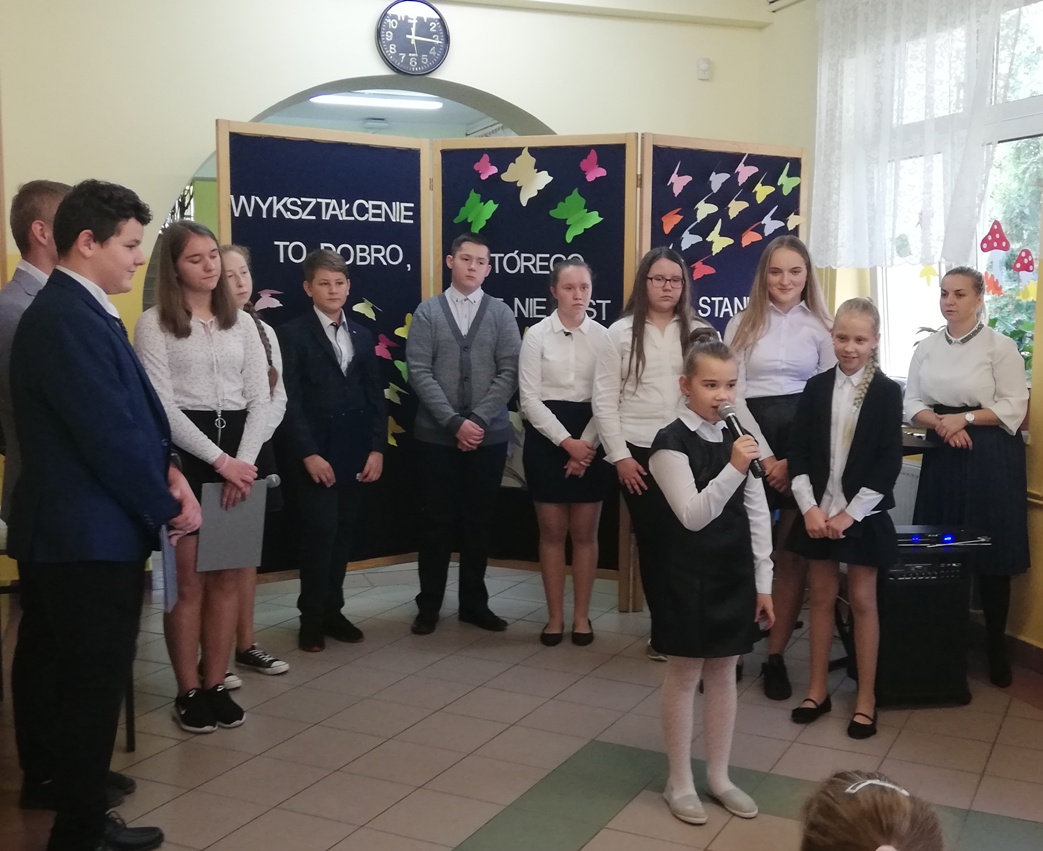 11 października w naszej szkole obchodziliśmy Dzień Edukacji Narodowej. W tym dniu odbył się uroczysty apel podczas którego uczniowie przygotowali krótki występ artystyczny. Uczniowie przygotowali wiersze tematyką związane z pracą nauczyciela (przygotowani przez p. Martę Kołodziejczak). Swoje życzenia w formie piosenki wyraziły również przedszkolaki (pod kierunkiem p. Emilii Napierała oraz p. Agnieszki Kołodziejczak). Uczniowie podziękowali swoim nauczycielom, emerytowanym nauczycielom oraz wszystkim pracownikom administracyjno – obsługowym szkoły za trud wkładany w edukację i wychowanie oraz wręczyli symboliczne upominki. Była to również okazja do spotkania z emerytowanymi pracownikami szkoły.