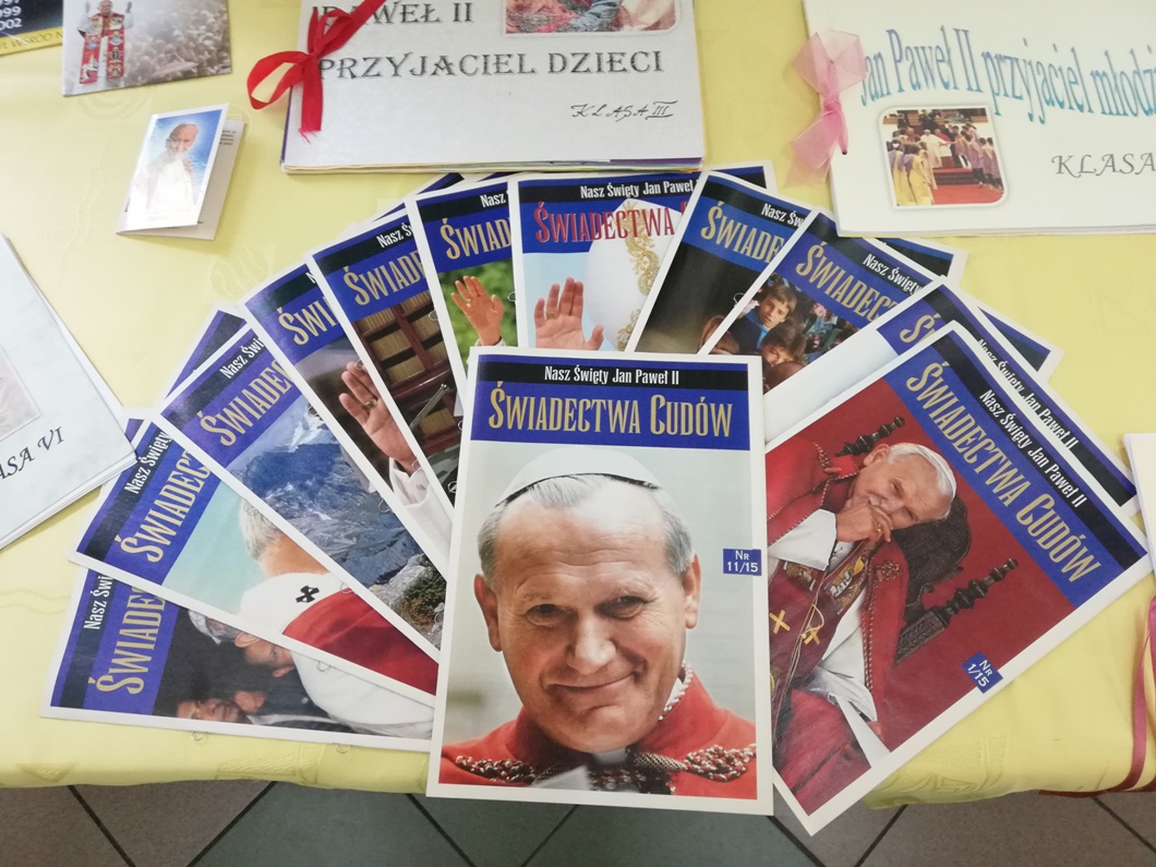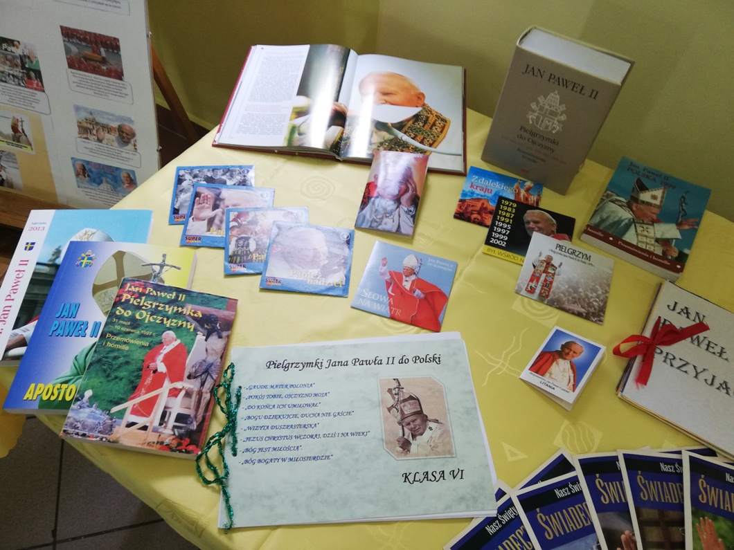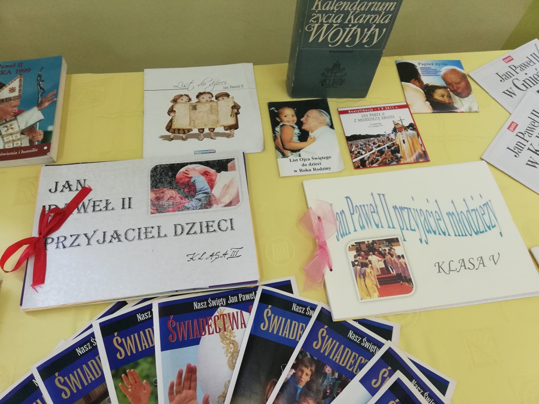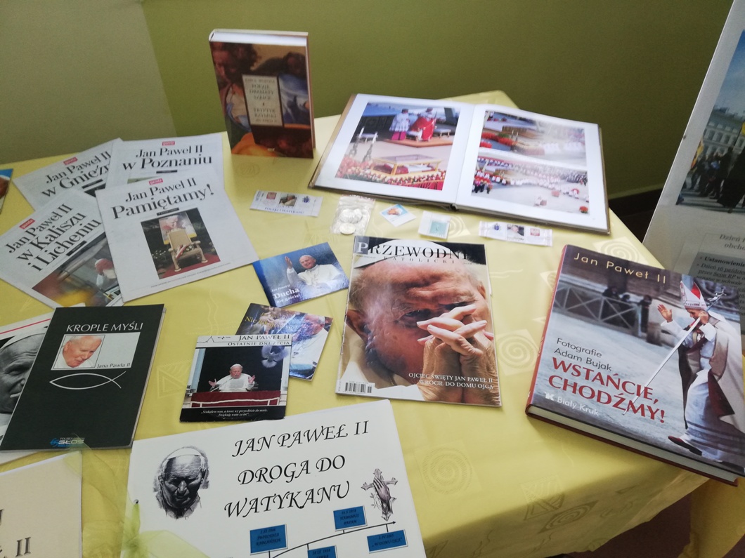 Z tej okazji w naszej szkole na lekcjach religii, odbyły się zajęcia poświęcone nauczaniu Świętego Jana Pawła II. Pani katechetka przygotowała także specjalną wystawę albumów, książek, gazet oraz materiałów prezentujących kulturalne i duchowe dziedzictwo Świętego Jana Pawła II.
