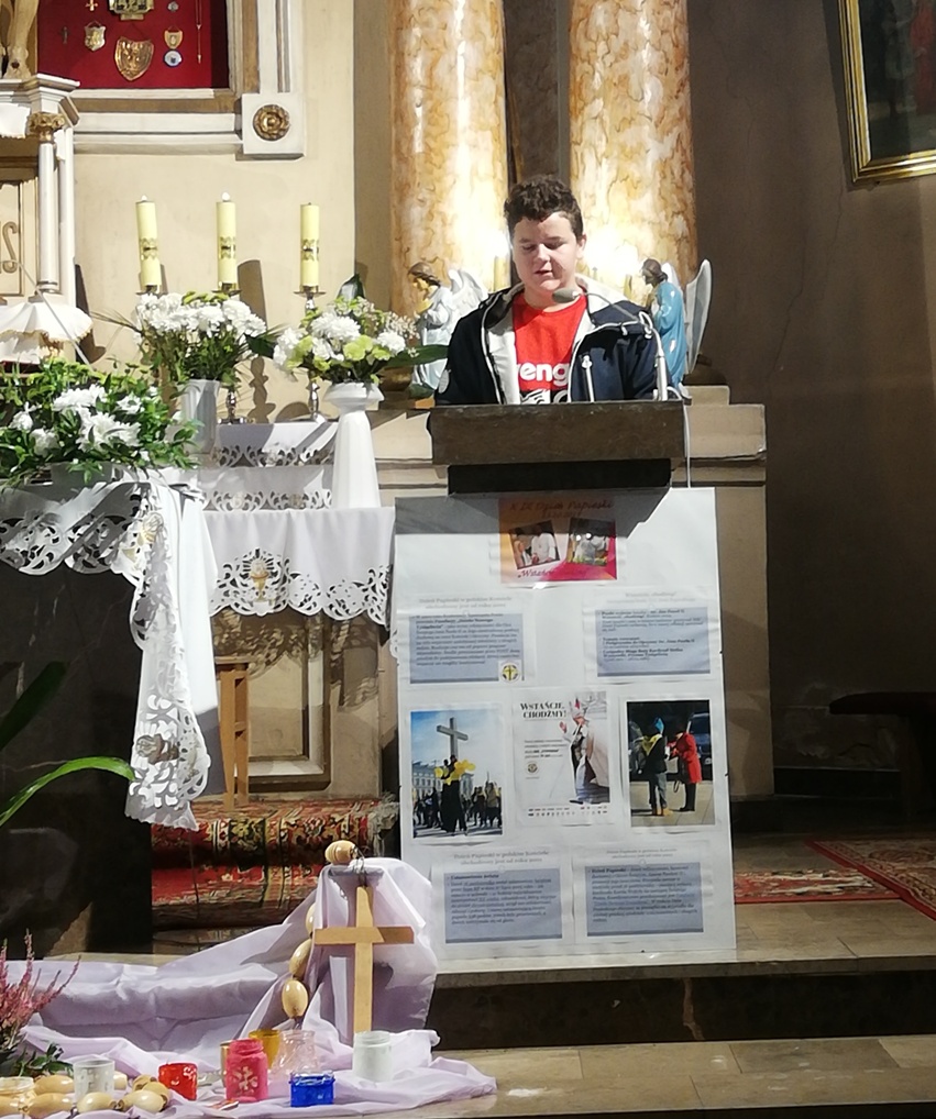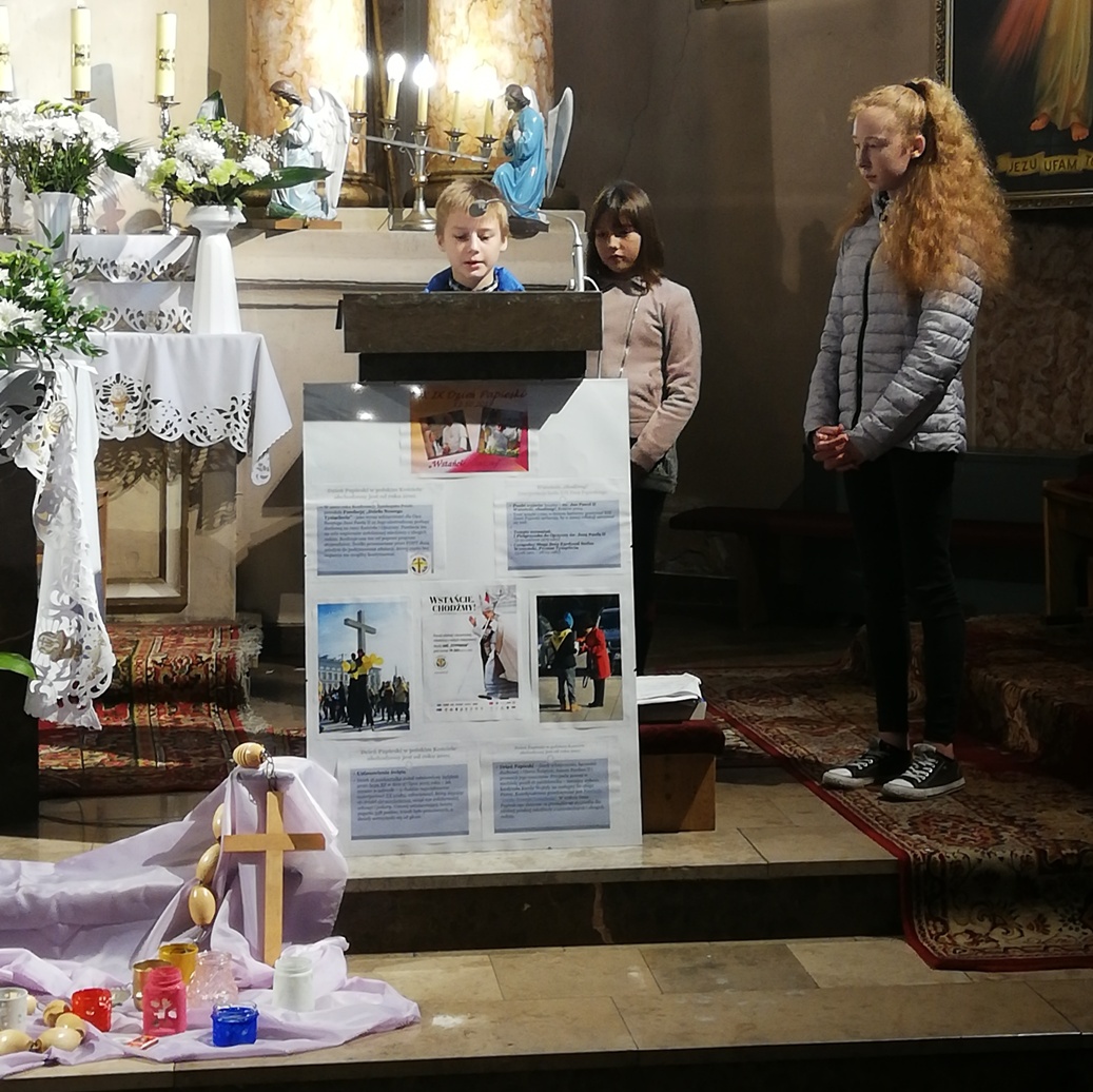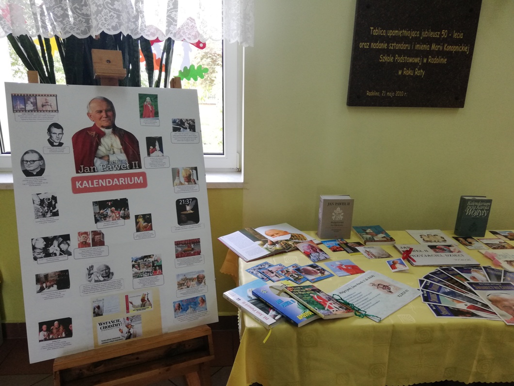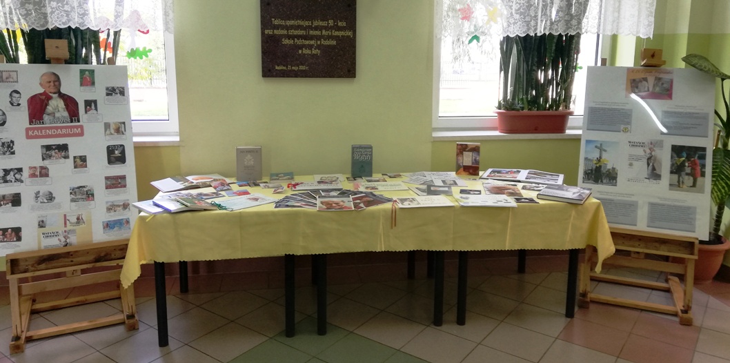 Z tej okazji w naszej szkole na lekcjach religii, odbyły się zajęcia poświęcone nauczaniu Świętego Jana Pawła II. Pani katechetka przygotowała także specjalną wystawę albumów, książek, gazet oraz materiałów prezentujących kulturalne i duchowe dziedzictwo Świętego Jana Pawła II.