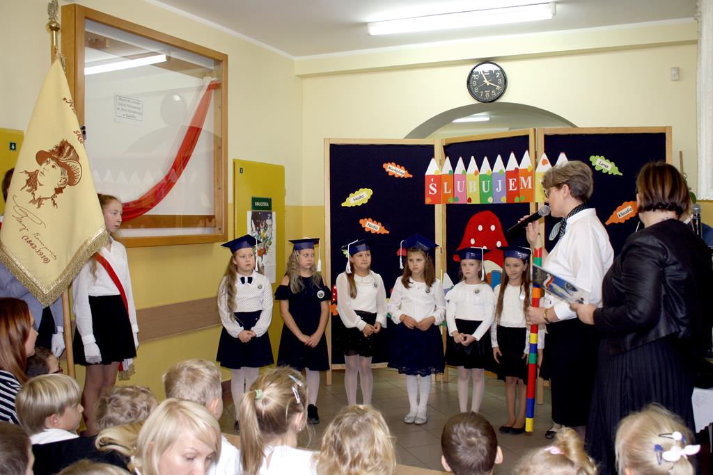Tymi słowami 21 października pierwszaki z naszej szkoły złożyli uroczyste ślubowanie oraz zostali pasowani na pełnoprawnych uczniów Szkoły Podstawowej im. M. Konopnickiej w Radolinie. W tej ważnej chwili naszym małym bohaterom towarzyszyli: cała społeczność uczniowska, Grono Pedagogiczne oraz rodzice. Pierwszoklasiści przedstawili swoje umiejętności artystyczne w krótkim montażu słowno- muzycznym. Wśród uczniów powitali ich również starsi koledzy z klasy VIII, wręczając drobne upominki, a także przewodnicząca Rady Rodziców pani Lidia Dąbkiewicz. Dyrektor szkoły pani Alina Kozłowska podziękowała małym bohaterom, a rodzicom i wychowawczyni życzyła wielu sukcesów, zadowolenia z dzieci i owocnej współpracy.