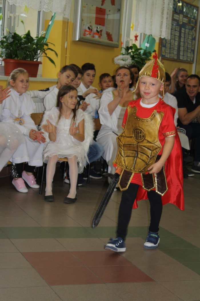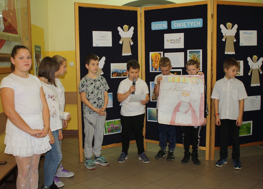 Nasze spotkanie na szkolnym korytarzu rozpoczęli uczniowie z oddziału „Zerowego” śpiewem piosenki „Święty uśmiechnięty”, którą przygotowali specjalnie na dzisiejszy dzień. Po ich występie rozpoczęły się prezentacje świętych. I tak: