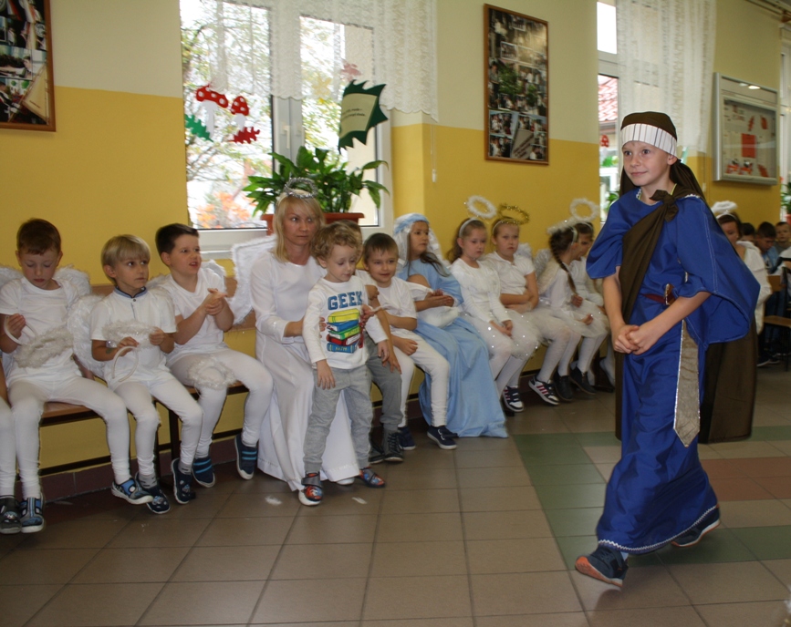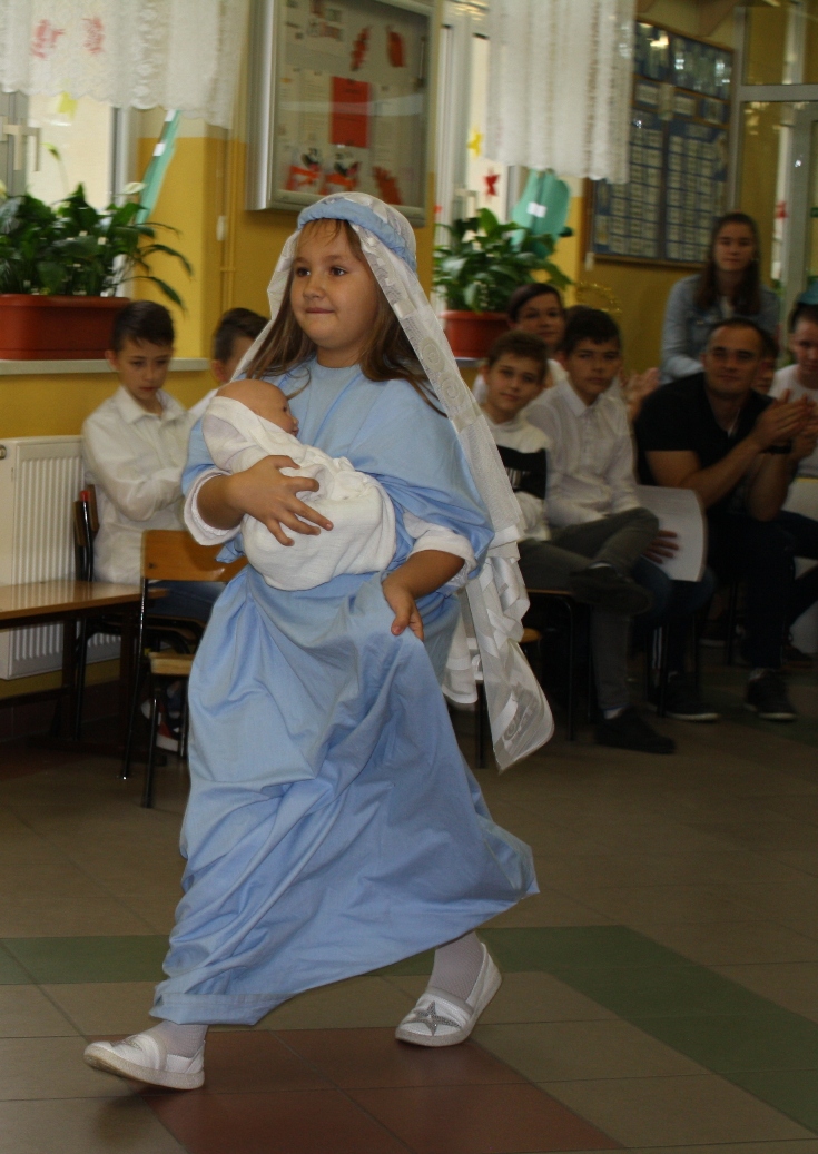 -uczniowie klasy pierwszej przedstawili postać Najświętszej Marii Panny.