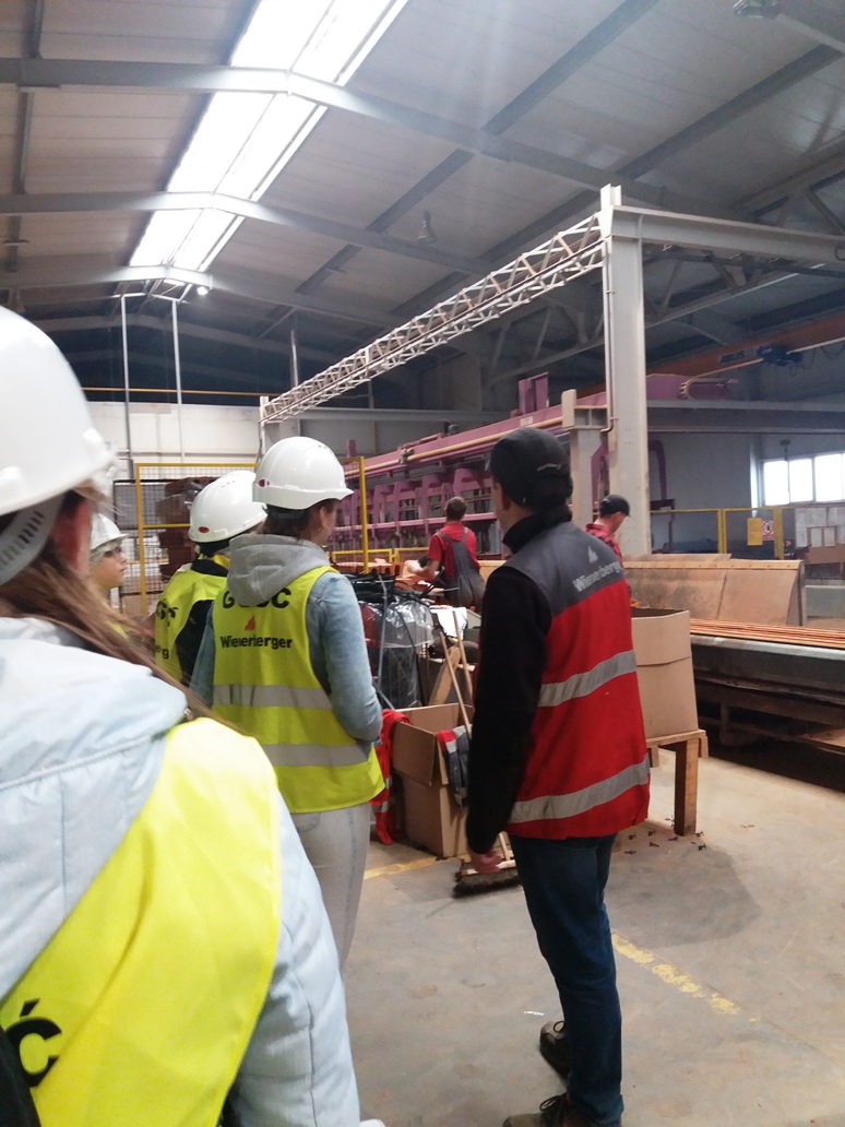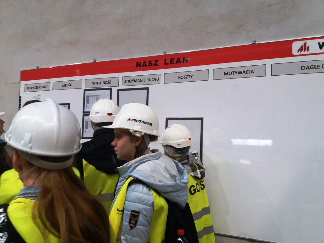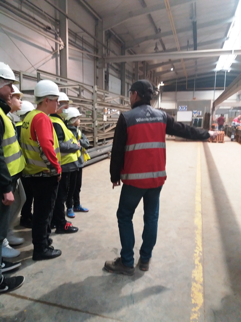 Zwiedzanie firmy rozpoczęło spotkaniem się z kierownikami: Panem Tomaszem Budnym i Panem Mirosławem Olszewskim, którzy przeprowadzili uczniom profesjonalne szkolenie BHP, informując o zasadach obowiązujących na terenie zakładu pracy. Po czym ubrani w kamizelki i kaski ochronne udaliśmy się obejrzeć cały proces produkcyjny. Panowie kierownicy opowiadali uczniom o charakterze zakładu pracy, zawodach i stanowiskach pracy funkcjonujących na terenie przedsiębiorstwa. Przechodząc na poszczególne hale produkcyjne młodzież przyglądała się pracy pracowników, maszyn i imponującym produktom, które są wytwarzane w Wienerberger.