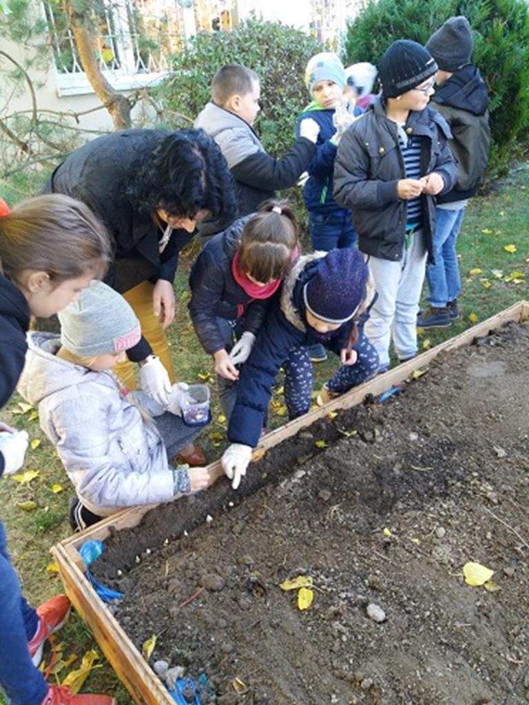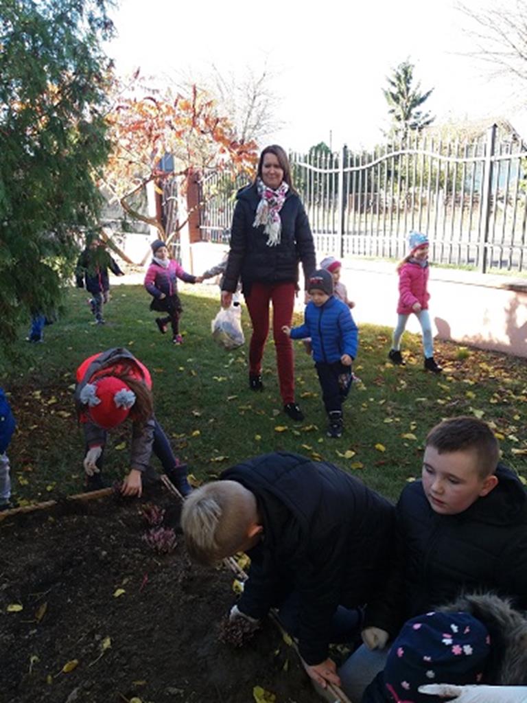 Prace rozpoczęły się od budowy ogródka, w której pomógł nam p. Leszek Dulcyt. Potem nawieźliśmy ziemi z pomocą p. Ani Szymczak, zagrabiliśmy i posadziliśmy cebulki kwiatów, aby na wiosnę cieszyły nasze serca.