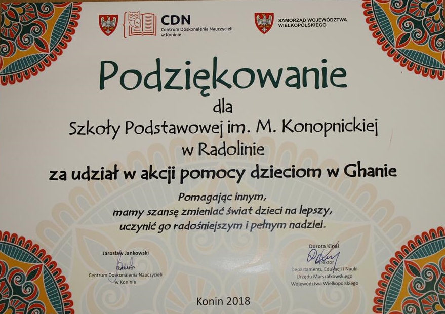 Nasza szkoła otrzymała podziękowanie za udział w akcji: „Wsparcie edukacji w Ghanie”. W zeszłym roku szkolnym zorganizowaliśmy we współpracy z Centrum Doskonalenia Nauczycieli w Koninie zbiórkę materiałów dydaktycznych potrzebnych do nauki i przekazaliśmy dzieciom z dalekiego kraju: kredki, plastelinę, zeszyty, wycinanki, gry edukacyjne, klocki, bloki rysunkowe, układanki, puzzle oraz zabawki. W to przedsięwzięcie zaangażowała się cała społeczność szkolna wraz z rodzicami.